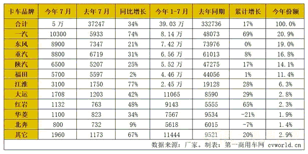在7月份前十強企業(yè)中,所有廠家都實現(xiàn)了同比正增長。同比增幅等于大于行業(yè)平均水平的有5家,分別為一汽解放(銷售1.03萬輛,增長74%)、江淮格爾發(fā)(銷售3100輛,增長77%)、大運重卡(銷售1708輛,增長42%)、上汽依維柯紅巖(銷售1132輛,增長48%),以及華菱重卡(銷售1100輛,增長34%)。剩余五家企業(yè)的銷量同比增幅低于行業(yè),其中,東風銷售8900輛,同比增長21%;重汽銷售8800輛,同比增長31%;陜汽銷售6500輛,同比增長25%;福田銷售5700輛,同比增長2%;北奔銷售800輛,同比增長9%。