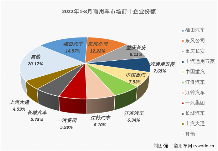 與去年同期相比,福田、五菱、長安、大通、長城、江鈴和江淮等企業(yè)在商用車市場的累計份額實現(xiàn)增長,其中重慶長安今年1-8月累計份額較去年同期增長了3.06個百分點,五菱、大通和長城的累計份額也均增長了超1個百分點,分別增長了1.61%、1.39%和1.48%;福田、江淮和江鈴三家企業(yè)今年的累計份額則分別增長了0.43%、0.59%和0.76%。